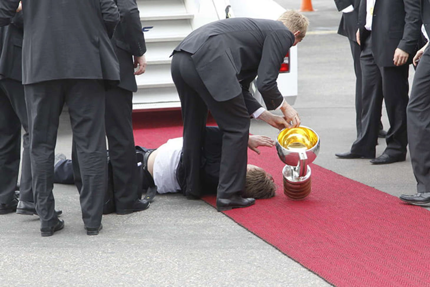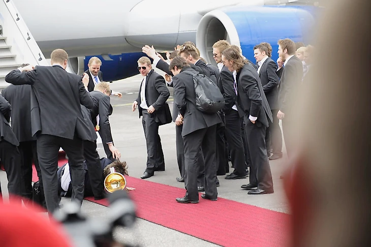 В предыдущий раз – в 2011-м – сборная Финляндии тоже повредила кубок, только сделали это не игроки, а тренер вратарей и уже на родине. Паси Нурминен не справился с силой притяжения и упал прямо на трофей.