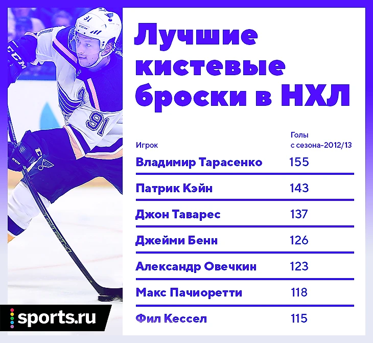 Но у Тарасенко есть своя уникальная фишка — кистевой бросок. Мы уже как-то привыкли, что фирменный бросок русского игрока — это «раззудись-плечо-щелчок» Овечкина из левого круга вбрасывания, что на самом деле не типично для русской и советской школы. Кистевой Тарасенко вовсе не выглядит мощным. Владимир как будто не прикладывает сил к клюшке, а легким движением кисти придает шайбе максимальное ускорение, после чего ее уже нельзя остановить. Тарасенко дебютировал в НХЛ в 2013-м — за эти шесть лет у него 9-е место в общей таблице снайперов, но в кистевом броске ему нет равных. 155 шайб из 211 были забиты именно так.