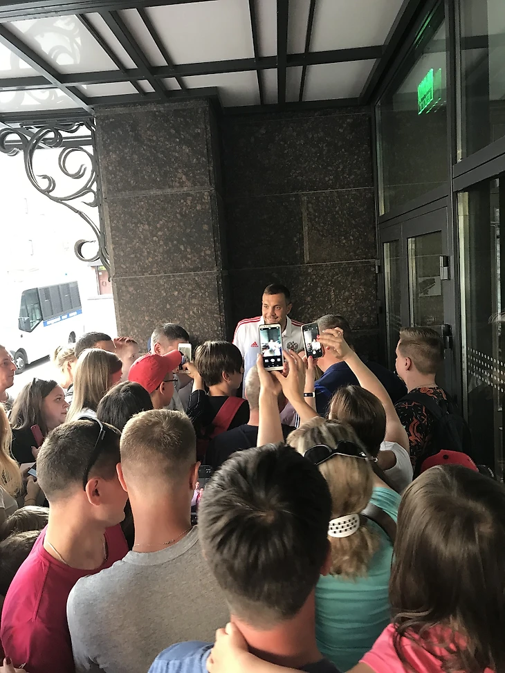А уже около двух часов у отеля сборной вновь собрались фанаты, чтобы заполучить автограф любимых игроков российской команды. Смолов, Головин, Дзюба – вот эти игроки пользуются огромным спросом у болельщиков нашей сборной.
