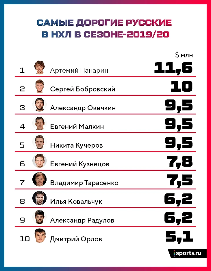 Среди русских игроков у пары экс-хоккеистов «Коламбуса» безусловное лидерство – новые правила рынка выводят их в топ. Да, чистыми Никита Кучеров заработает больше Артемия (налоговый рай Флориды), но вот по части суммарной зарплаты он все равно уступает и Бобровскому, и Панарину.