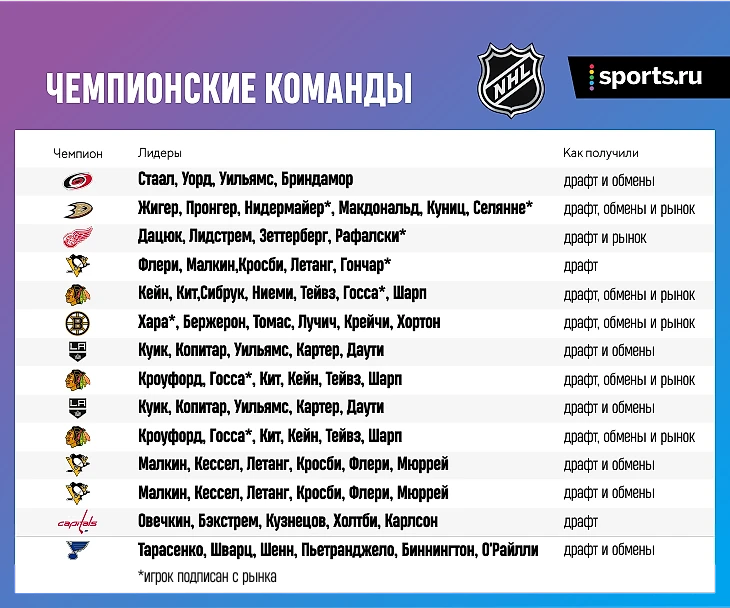 2. Очень странно измерять успех команды только выигрышем кубка стэнли. Да, цель у всех кс, но драфтуют тоже 30 команд, а побеждает одна. Что-то шансы тоже так себе. Не драфтовать теперь что ли? Если и оценивать то нужно относительно прогресса команды с предыдущими сезонами и попадания в плов. Ибо в нхл даже с вайлдкард команды кубок берут. Это не нба. И тут уже картина совсем не такая как вы рисуете. Даже тот же радулов - это явная удача для далласа. Я уж молчу еще что в вашей табличке чемпионов каждая вторая команда имеет людей с рынка.