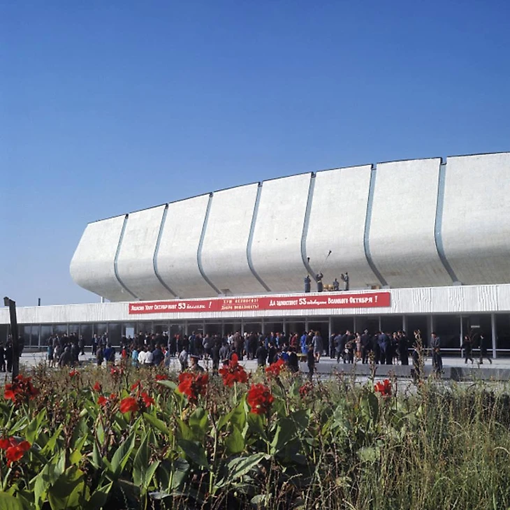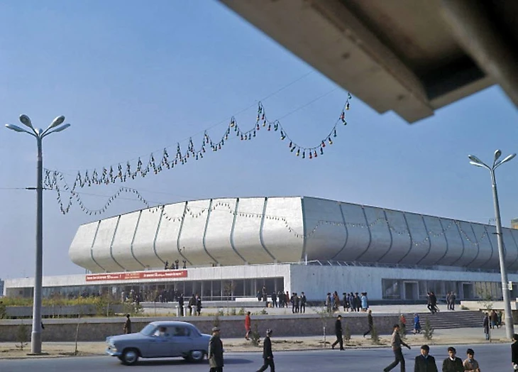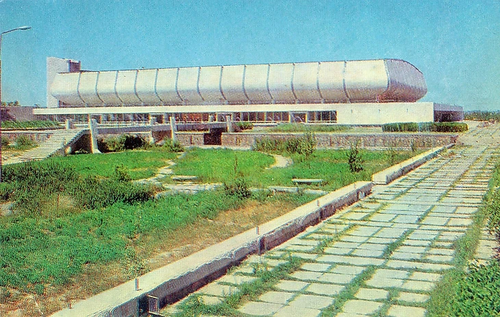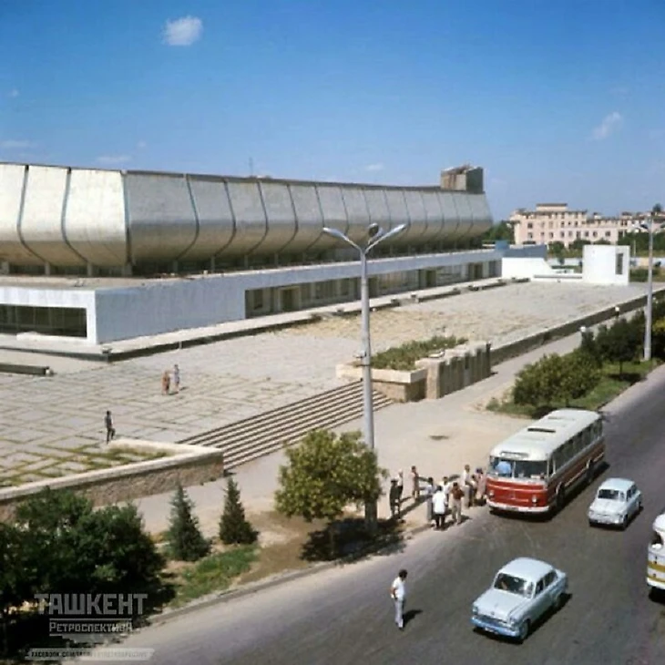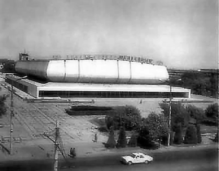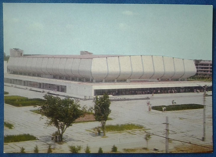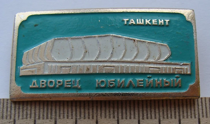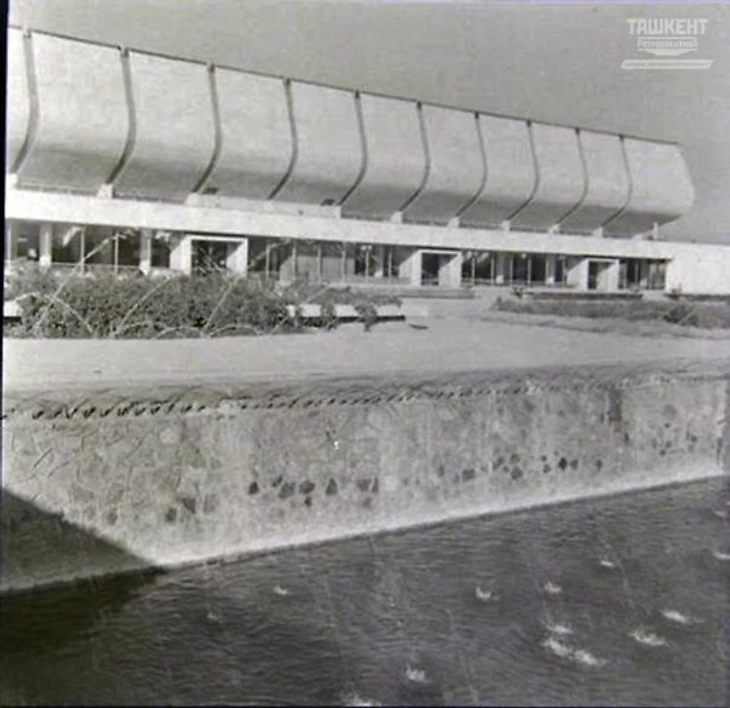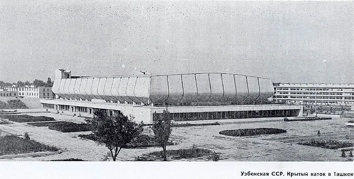 В своем материале Самая южная хоккейная команда СССР я пытался реконструировать историю возникновения «Юбилейного», который был построен на северо-западной окраине города вблизи студгородка Ташкентского университета (или по другому Вузгородка). По мнению sovmodernism.livejournal.com за основу был взят типовой проект № 2С-09-35 (140-69) «Закрытый демонстрационный каток» проектного института «Союзспортпроект» (архитекторы М.А. Аристов, Ю.А. Регентов, инженер С.Н. Бадмаева). Такой каток был рассчитан на 5 000-7 000 зрителей и имел ледовую площадку 61 х 30 метров. Но ташкентцы творчески подошли к этому проекту. В итоге у коллектива проектировщиков института «Ташгипрогор», возглавляемого Генрихом Моисеевичем Александровичем (архитекторы: Г. Александрович, О. Палиева, В. Ясногородская; инженеры: А. Иванов, Г. Бельфер, Г. Пергаменцева, М. Пережогин, В. Вдовиченко, Н. Гарштейн; художественное оформление: И. Липене-Навицкайте, Ю. Липас, Р. Мухамедханов, К. Хайдаров, В. Чуб, Э. Горбунов, А. Ган) получилось оригинальное здание, в архитектуре которого использован принцип пирамидального построения. Основные принципы советского модернизма - максимально лаконичный облик, прямые линии, «открытость» зданий, мозаика - тоже присутствуют.