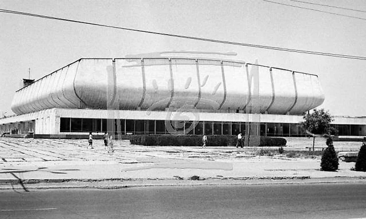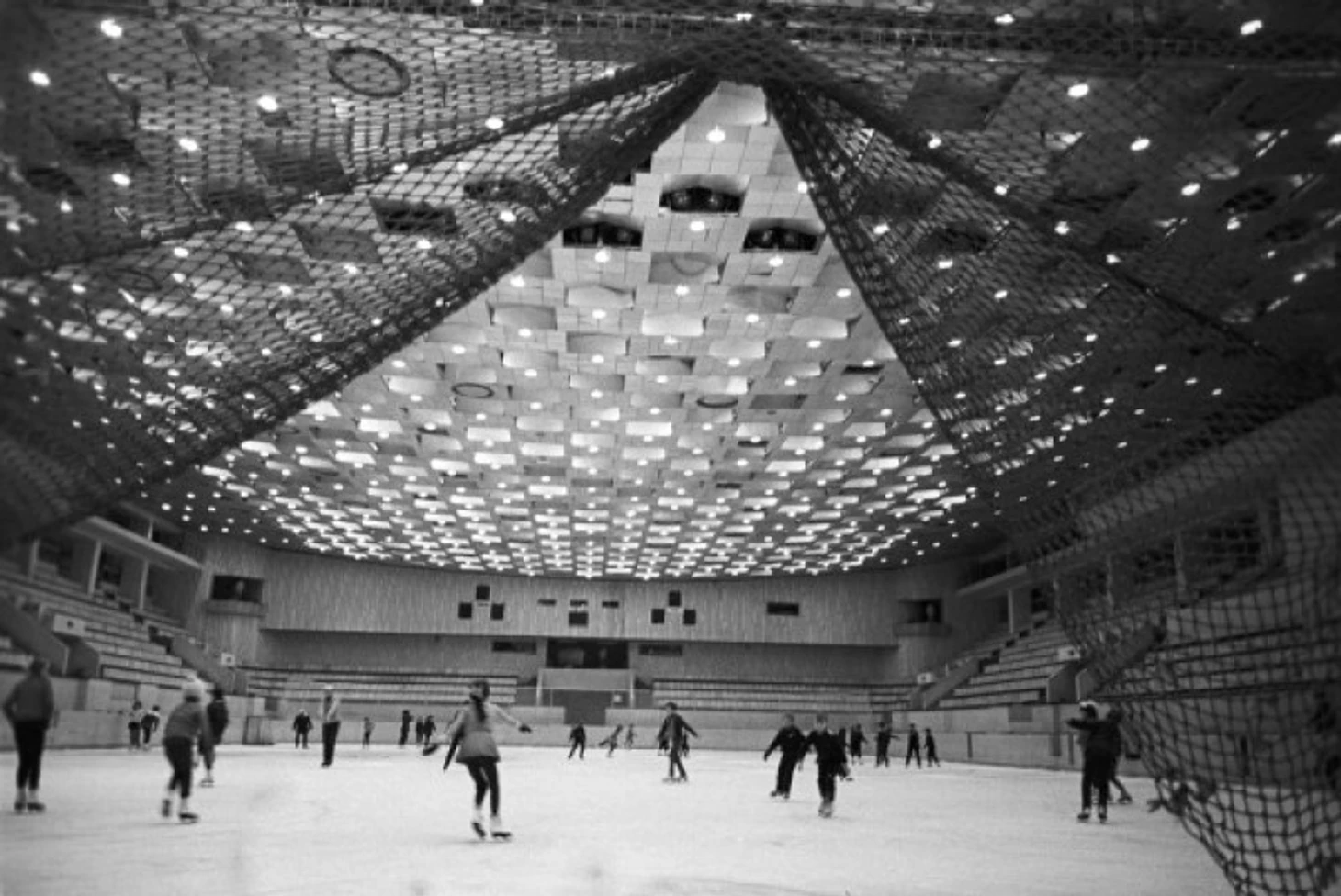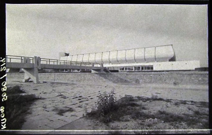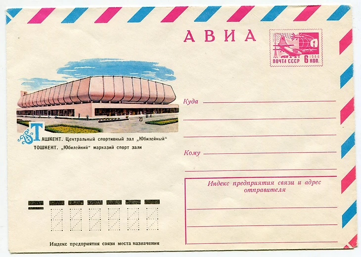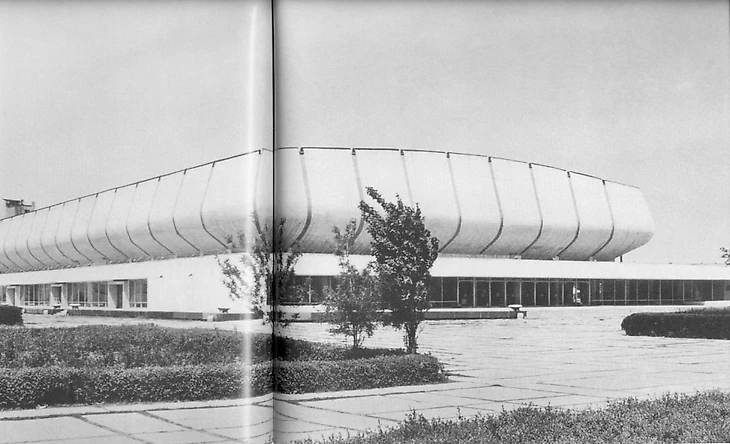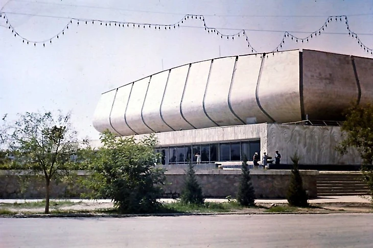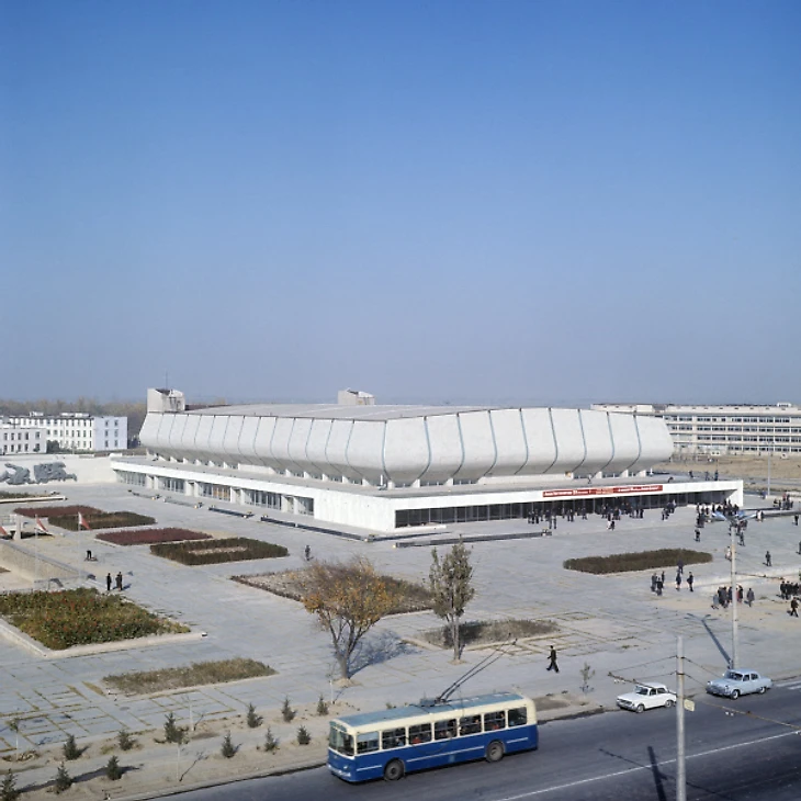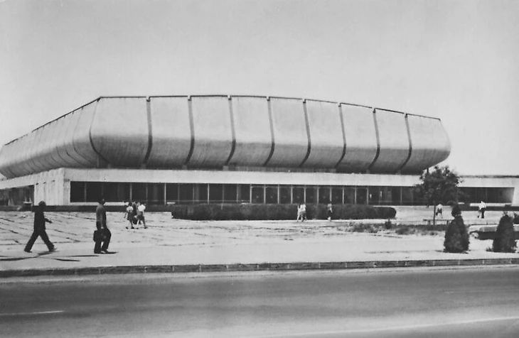 В своем материале Самая южная хоккейная команда СССР я пытался реконструировать историю возникновения «Юбилейного», который был построен на северо-западной окраине города вблизи студгородка Ташкентского университета (или по другому Вузгородка). По мнению sovmodernism.livejournal.com за основу был взят типовой проект № 2С-09-35 (140-69) «Закрытый демонстрационный каток» проектного института «Союзспортпроект» (архитекторы М.А. Аристов, Ю.А. Регентов, инженер С.Н. Бадмаева). Такой каток был рассчитан на 5 000-7 000 зрителей и имел ледовую площадку 61 х 30 метров. Но ташкентцы творчески подошли к этому проекту. В итоге у коллектива проектировщиков института «Ташгипрогор», возглавляемого Генрихом Моисеевичем Александровичем (архитекторы: Г. Александрович, О. Палиева, В. Ясногородская; инженеры: А. Иванов, Г. Бельфер, Г. Пергаменцева, М. Пережогин, В. Вдовиченко, Н. Гарштейн; художественное оформление: И. Липене-Навицкайте, Ю. Липас, Р. Мухамедханов, К. Хайдаров, В. Чуб, Э. Горбунов, А. Ган) получилось оригинальное здание, в архитектуре которого использован принцип пирамидального построения. Основные принципы советского модернизма - максимально лаконичный облик, прямые линии, «открытость» зданий, мозаика - тоже присутствуют.