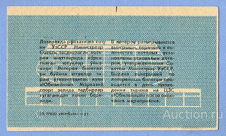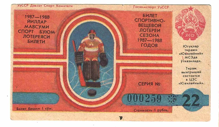Снимков «Юбилейный» после 1983 года я не нашел. Скорее всего, это подтверждает, то что история среднеазиатского хоккея начала катится к своей низшей точке. Встретился билет вещевой лотереи, тираж которой проводился в ЦЗС. Аналогичные мероприятия в это время проходят на стадионе «Пахтакор» и на ипподроме.