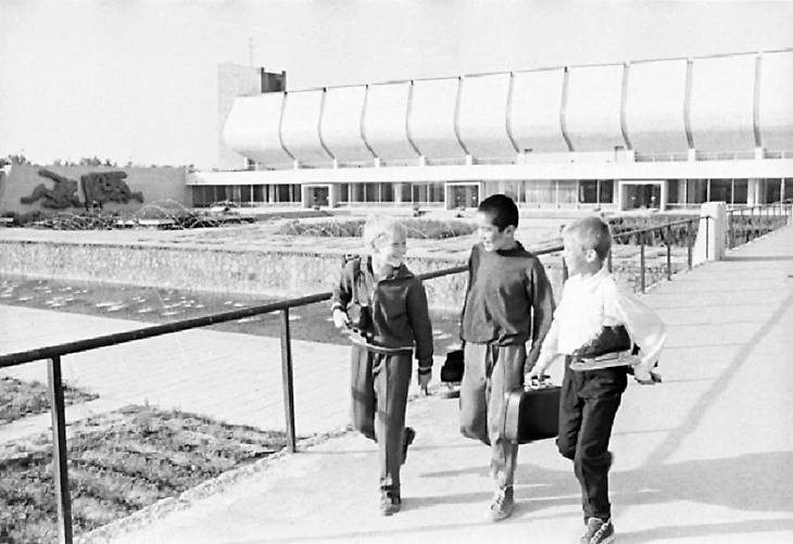 ДЮСШ по хоккею открылась. Ребята с коньками идут с тренировки. Рядом с ареной на стене летнего кафе несохранившийся горельеф «Хоккеисты» работы Юозаса Липаса (Виктор Чернов/Библиотека изображений «РИА Новости»)