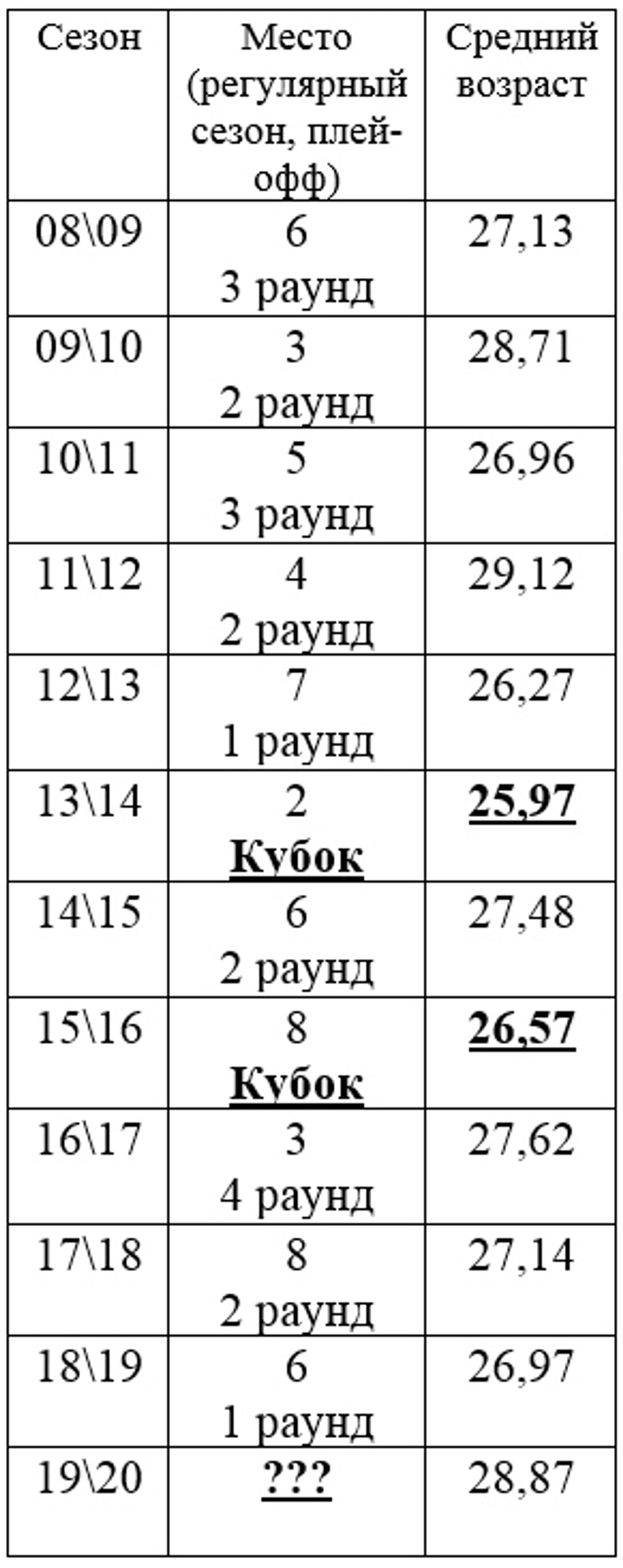 Прежде всего, давайте обратимся к голым цифрам. В таблице ниже вы можете отследить, как менялся средний возраст хоккеистов Металлурга за 11 сезонов в КХЛ, а также увидеть результаты команды в каждый из этих сезонов.