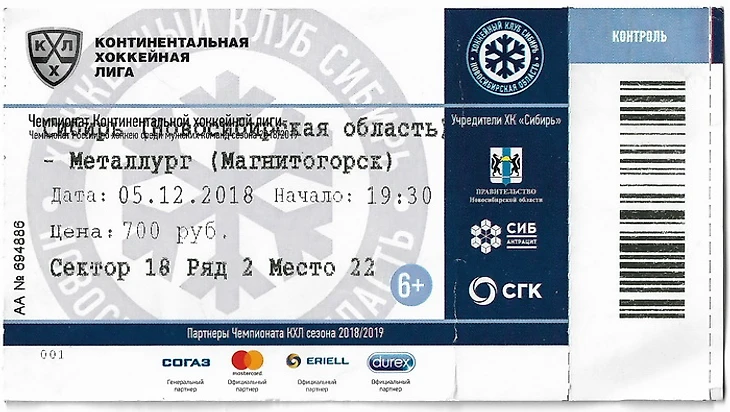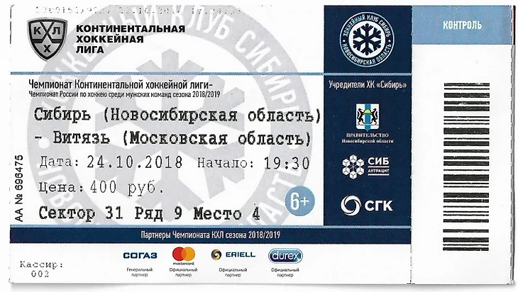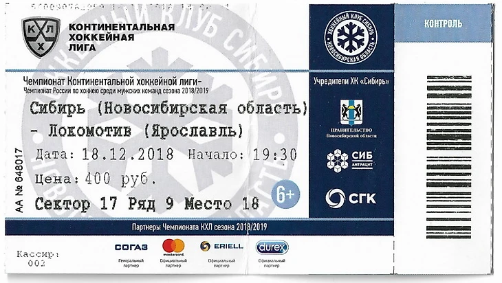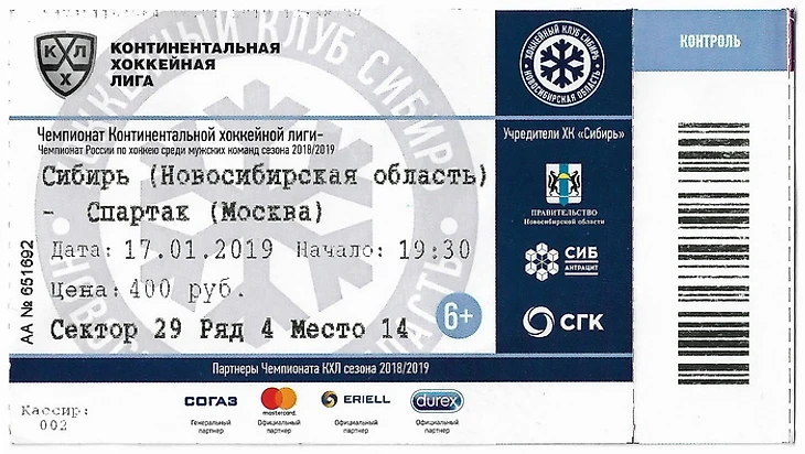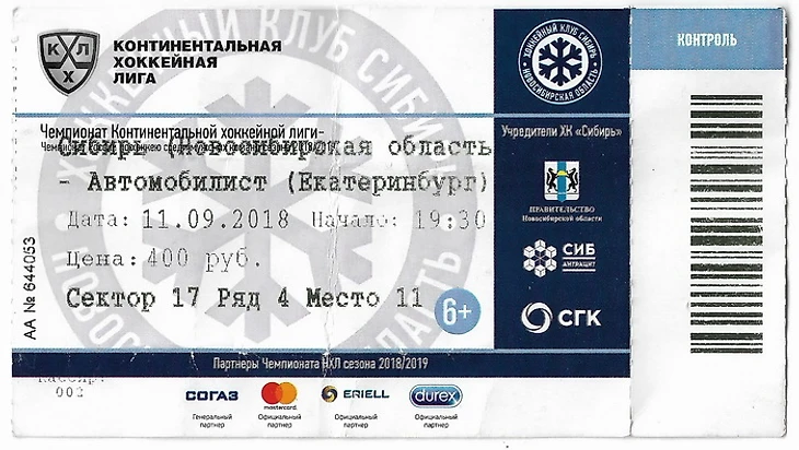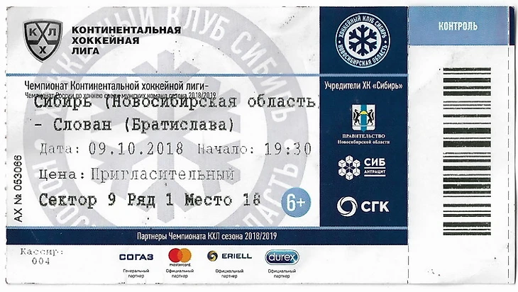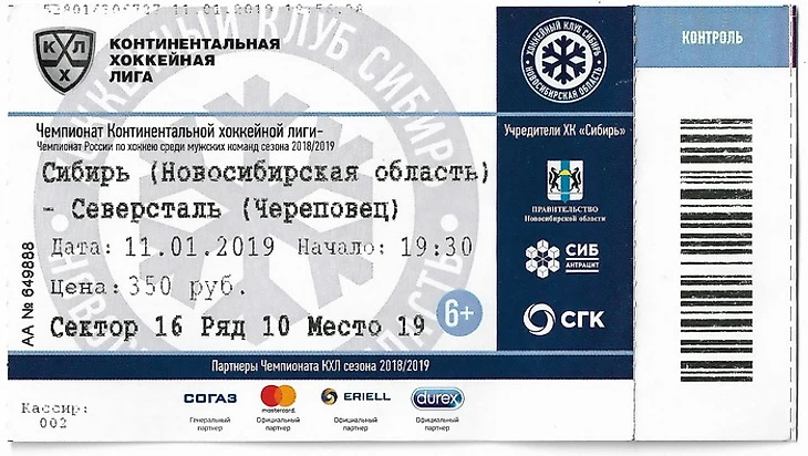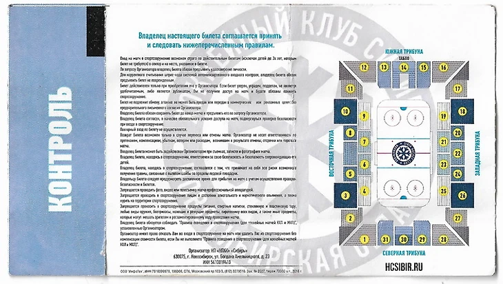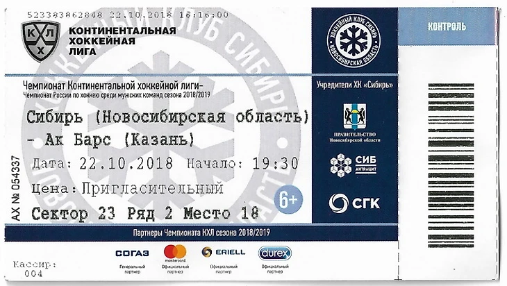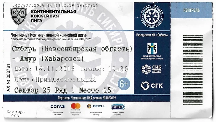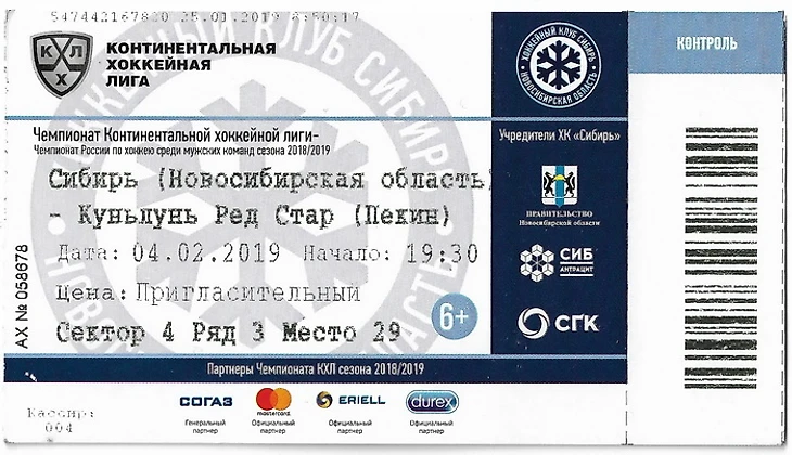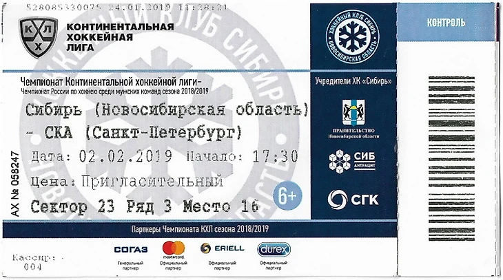 К сожалению, печать не на всех билетах одинаково аккуратная: если по горизонтали более менее помещается — максимум скобка уйдёт на тёмный блок, что не каждый и заметит. По вертикали может съехать основательно — на целую строку, что «Сибирь (Новосибирская область)» окажется на «Чемпионате Континентальной хоккейной лиги».