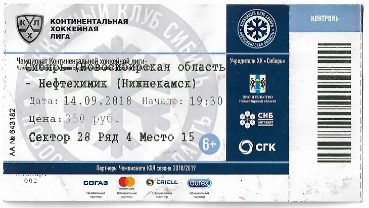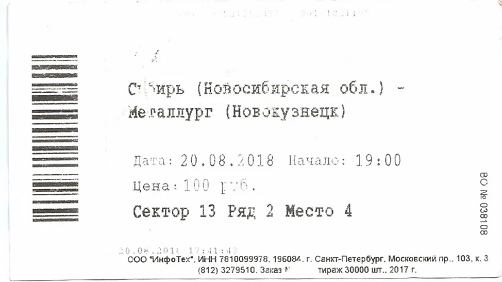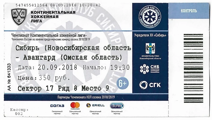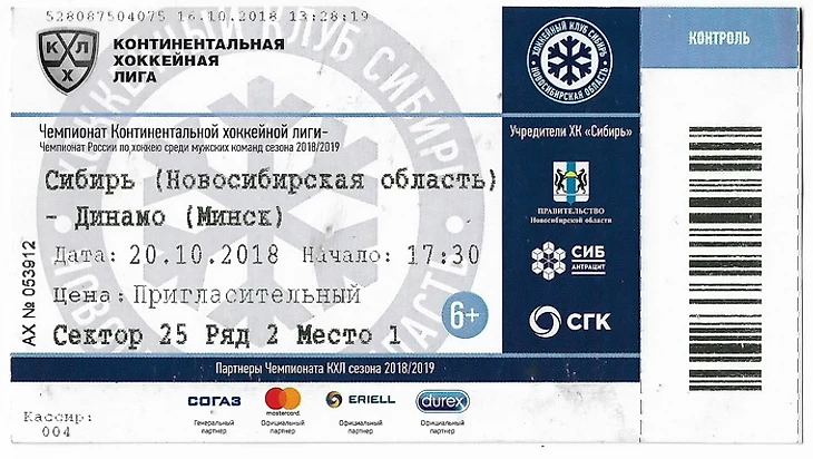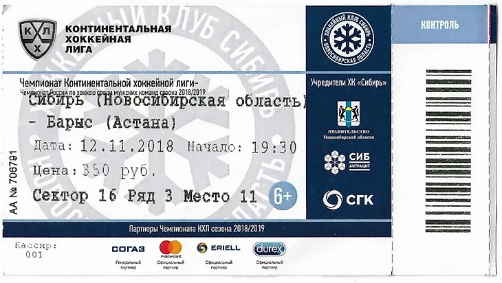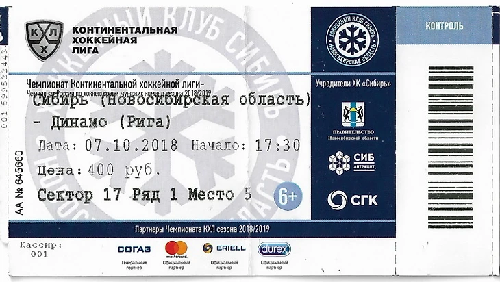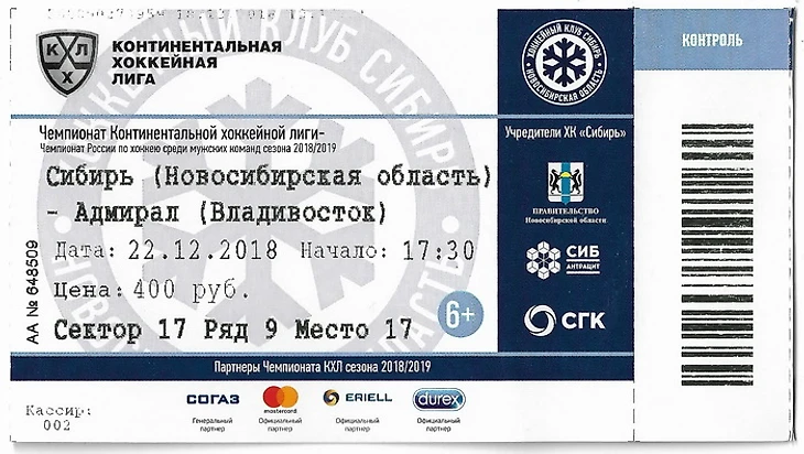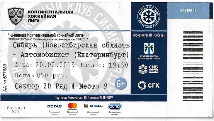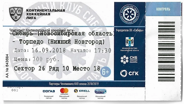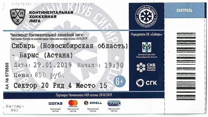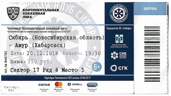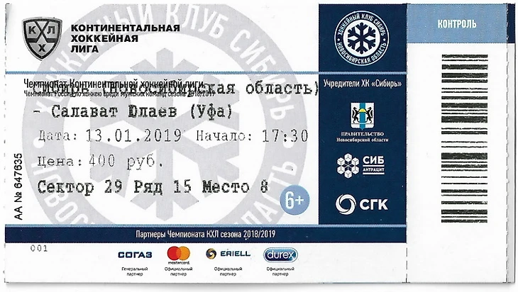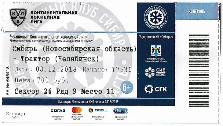 К сожалению, печать не на всех билетах одинаково аккуратная: если по горизонтали более менее помещается — максимум скобка уйдёт на тёмный блок, что не каждый и заметит. По вертикали может съехать основательно — на целую строку, что «Сибирь (Новосибирская область)» окажется на «Чемпионате Континентальной хоккейной лиги».