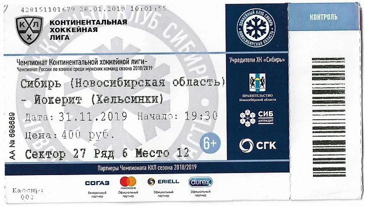 Кстати, ещё о косяках и ляпах. С матча против «Йокерита» я принёс домой два билета, и только на следующий день обнаружил опечатку: на билете указано не тридцать первое января, а тридцать первое ноября. Мало того, что случайно снесли матч в другой месяц, так ещё и на несуществующий день этого месяца.