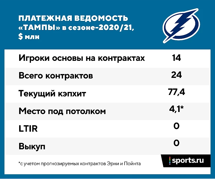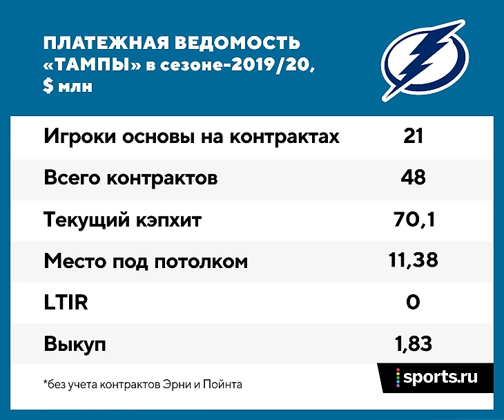 Но все это не так страшно, как следующее межсезонье: если Пойнта подпишут по-максимуму, а потолок зарплат не вырастет хотя бы на 1-2 миллиона, «Тампа» окажется в западне: