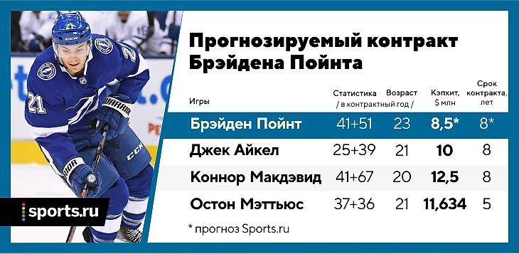 В межсезонье потолок для «Тампы» составляет 81,5 + 8,15 (10% превышения) = 89,65 млн. То есть в наличии 13,73 млн на двух игроков. Этого вполне достаточно, если учитывать, что Адам Эрни – ролевик из четвертого звена и вряд ли получит больше 1,5 млн. Итак, главный вопрос – за сколько переподпишут Брэйдена Пойнта? Для этого нам нужно сравнить его с игроками аналогичной позиции, которые провели контрактный год на уровне как минимум 70-80 очков.