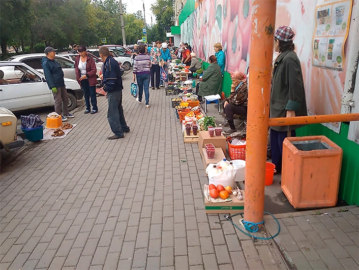 У гастронома бабушки торгуют овощами, грибами и ягодами. На жизнь не жалуются.