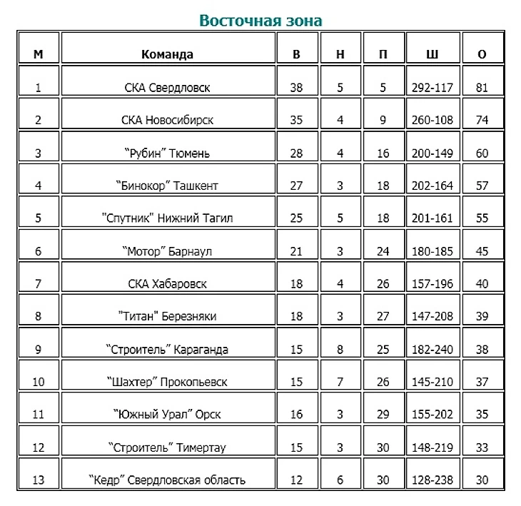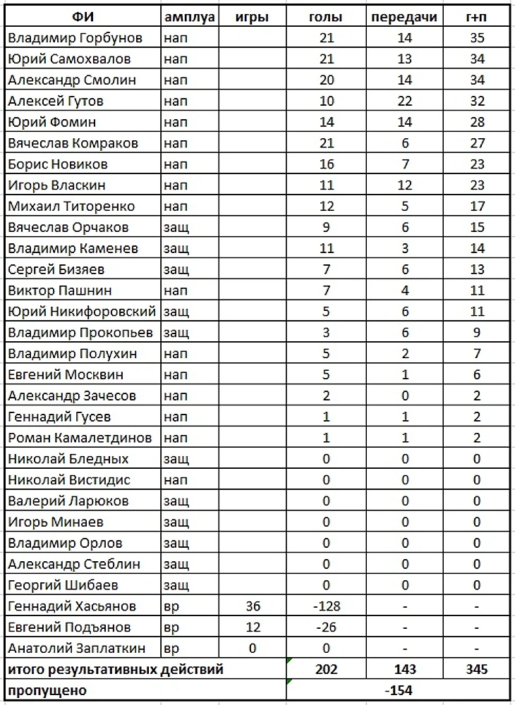 Есть разные данные сколько сыграл Евгений Подъянов - 12 или 13 игр. Количество пропущенных шайб здесь 154, а в общей таблице - 164. Из этого ясно одно, что основным вратарем команды был Геннадий (Зэфэр) Хасьянов.