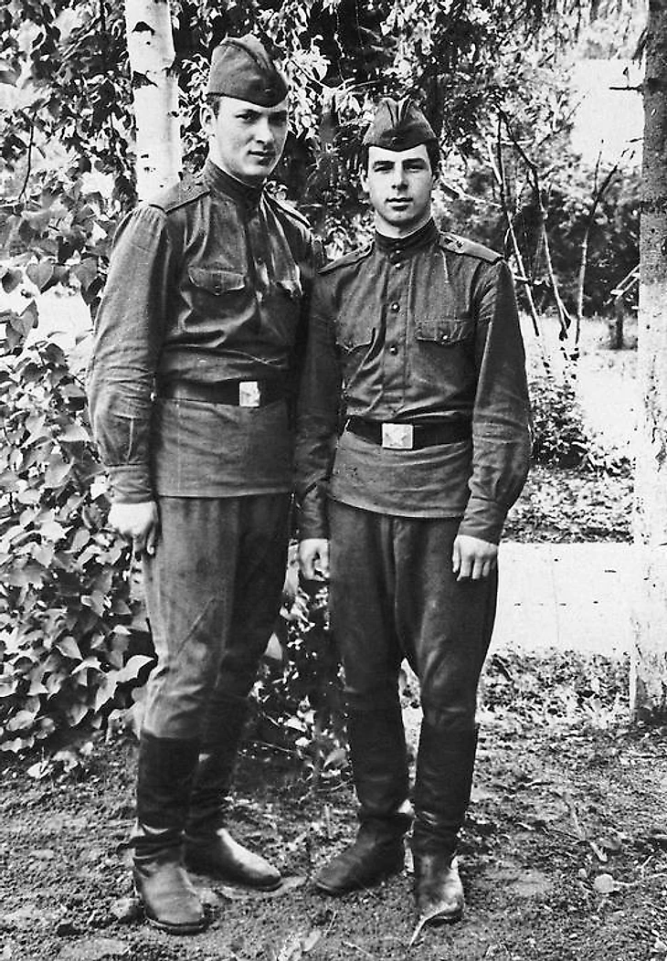 Солнечногорск, высшие военные курсы «Выстрел». Александр Смолин и Валерий Харламов. «Курс молодого бойца в Солнечногорске с Харламовым проходили – у Тарасова там «батя», командир части, полковник приятелем был, – и он нас, армейских игроков, туда всё время направлял. По разным, правда, причинам. Мы с Валеркой накануне принятия присяги сфотографировались на память.»