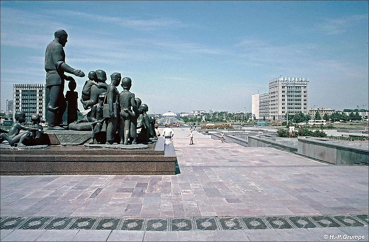 На этом снимке слева виден памятник семье кузнеца Шоахмеда Шамахмудова, принявшей в годы Великой Отечественной войны пятнадцать детей из разных республик СССР. Тех, кто потерял родителей и был эвакуирован в Ташкент. Среди детей, усыновленных Ахмедом и его женой Бахри Акрамовой, были русские, белорус, молдаванин, еврейка, латыш, казах, немка и татарин.