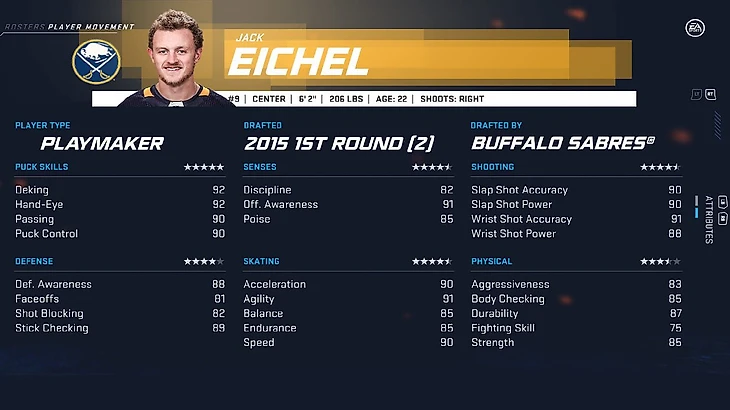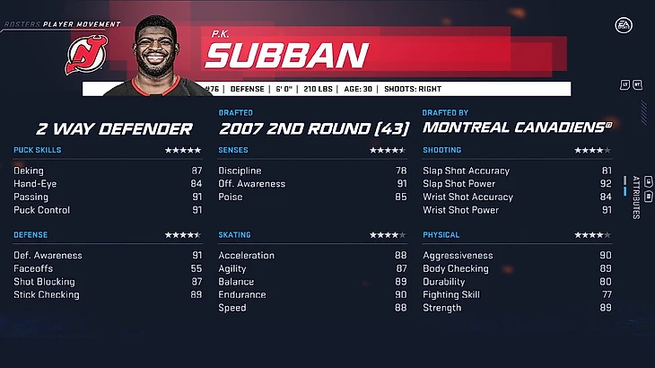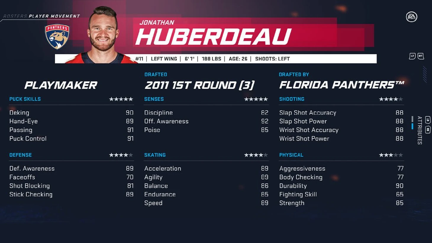 А вот рейтинг 88 для Юбердо, на наш взгляд, немного завышенный. Не самое крутое катание, очень средние бросковые скиллы и немного завышенные характеристики контроля шайбы, особенно учитывая то, что NHL-20 определяет Джонатана, как плеймейкера.