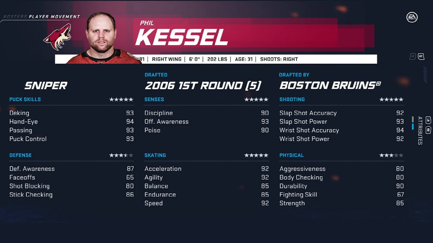 У новичка "Аризоны" крутейшие атакующие рейтинги! К этому можно добавить неплохое катание - и вот вам идеальный снайпер. Правда, рейтинг Фила значительно снижают слабая физика и не самые сильные оборонительные скиллы. В оборону даже виртуальный Кессел отрабатывать не будет!)