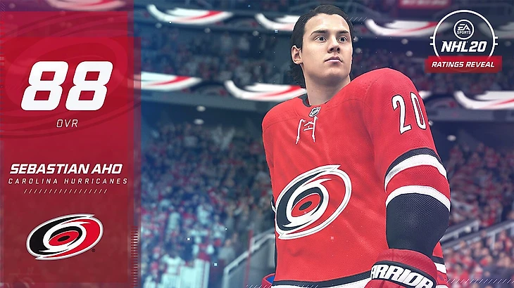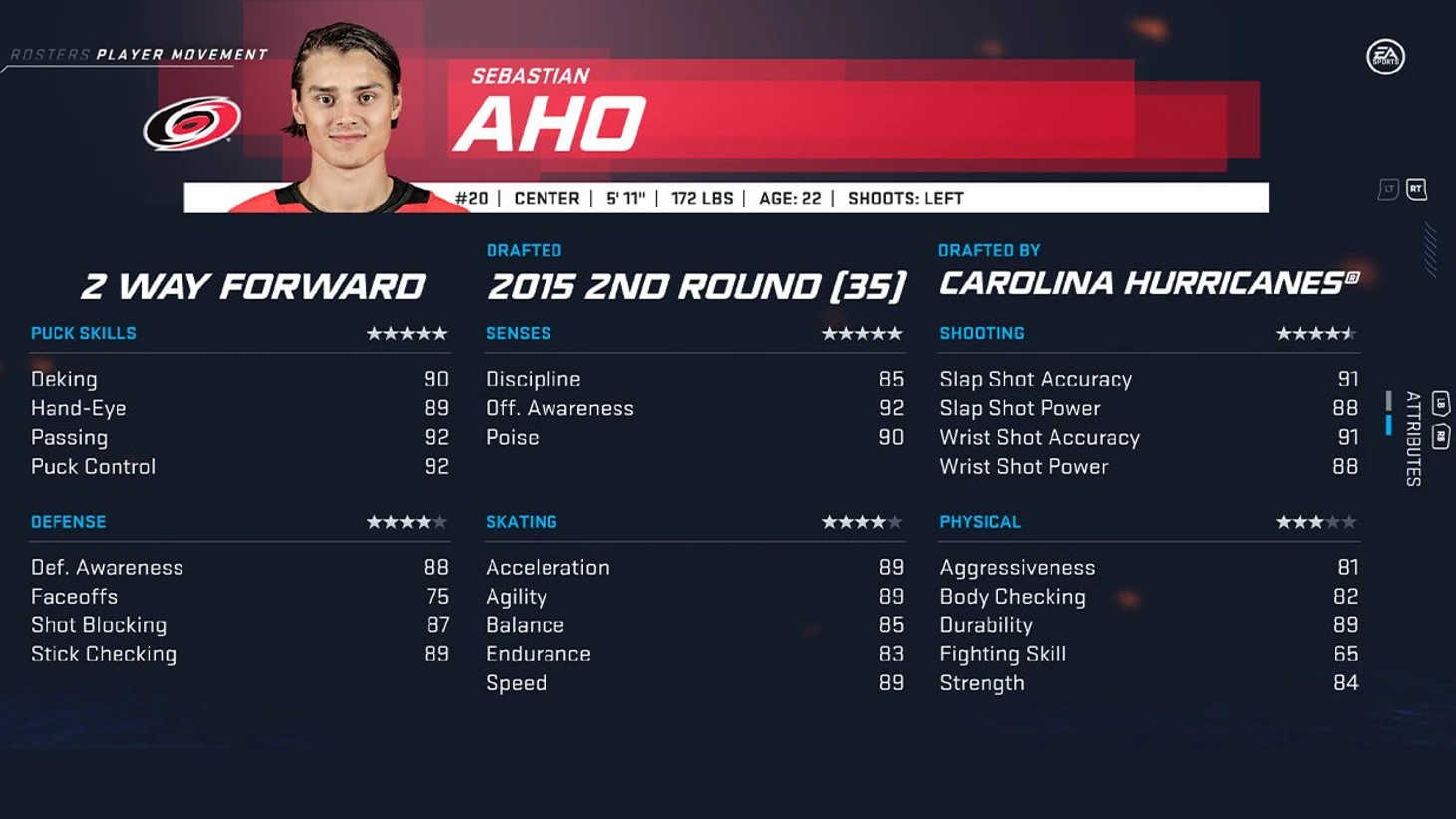 Неожиданно низко оказался и лидер "Каролины" финн Себастьян Ахо. Несмотря на то, что его специализация в игре указана, как "2-way forward", оборонительный рейтинг Ахо очень слабоват. Все круто с владением клюшкой, средние для NHL скиллы по броскам и просто отвратная 3-звёздная физика.