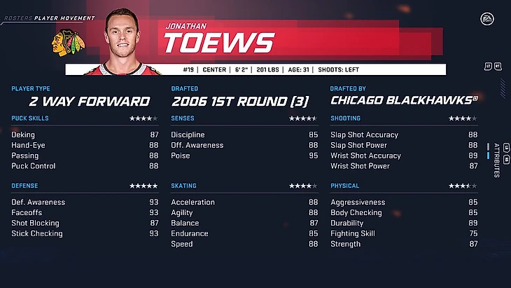 Несмотря на 42-ую позицию в рейтинге от EA нужно справедливо заметить, что для оборонительного форварда у Тейвза очень даже неплохие скиллы. 5 звёзд за оборонительные навыки - более чем объективно, а вот в некоторых моментах Джонатан заслуживал большего. Как минимум, ещё ползвезды за катание и владение клюшкой.
