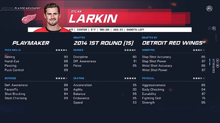 23-летний нападающий "Детройта" получил неплохие рейтинги по катанию: особенно все прекрасно у него со скоростью и ускорением. Разработчики также объективно оценили его мастерство владения клюшкой, а вот с бросковыми характеристиками и физикой у Дилана беда. Для NHL с её запредельными рейтингами по многим показателям 3.5 звезды по броскам для нападающего - это очень мало.