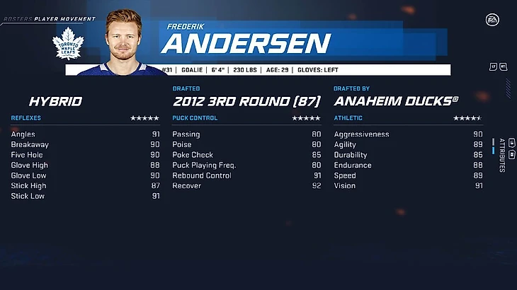 Первый вратарь в нашем списке - датчанин Фредерик Андерсен. С рейтингом вратарей как обычно много странностей. Наверное, Андересен заслуженно получил 5 звёзд за непосредственные вратарские скиллы, где показатели у него не опускаются не ниже 87. Но вот как EA могла дать ему 5 звёзд по владению клюшкой и работе с шайбой - загадка.