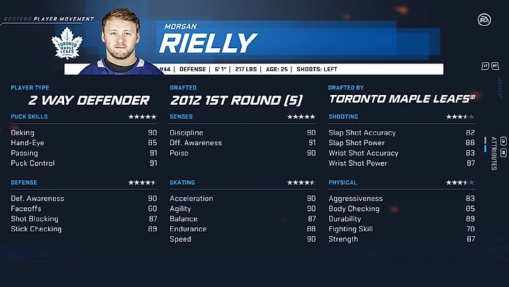 3.5 звезды для двустороннего защитника смотрятся немного несуразно. Думается, Райлли могли вполне дотянуть и до 4 звёзд, и убрать ползвезды в контроле шайбы. Всё-таки защитник с финтами в 90 баллов - это несерьезно даже для симулятора.