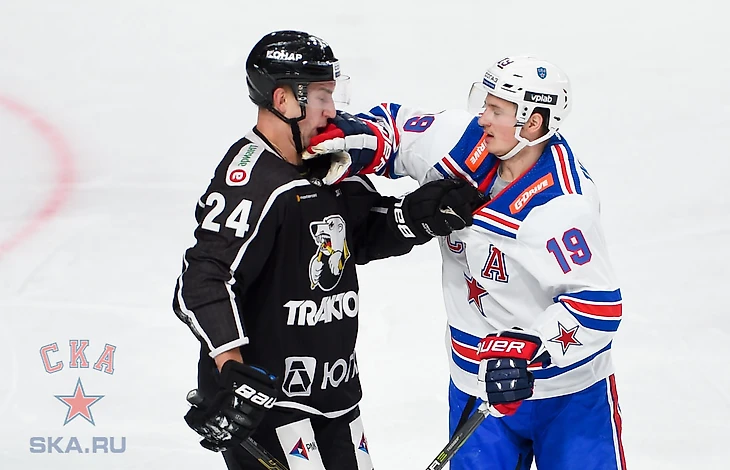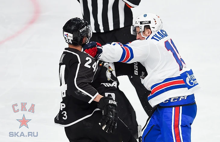 Но главный эпизод с участием Ткачева произошел между его очками: во втором периоде он толкнул в спину Руслана Карлина, за что получил подзатыльник от нападающего «Трактора». Так драка и завязалась: Ткачев даже не сбросил краги и в итоге оказался под соперником.