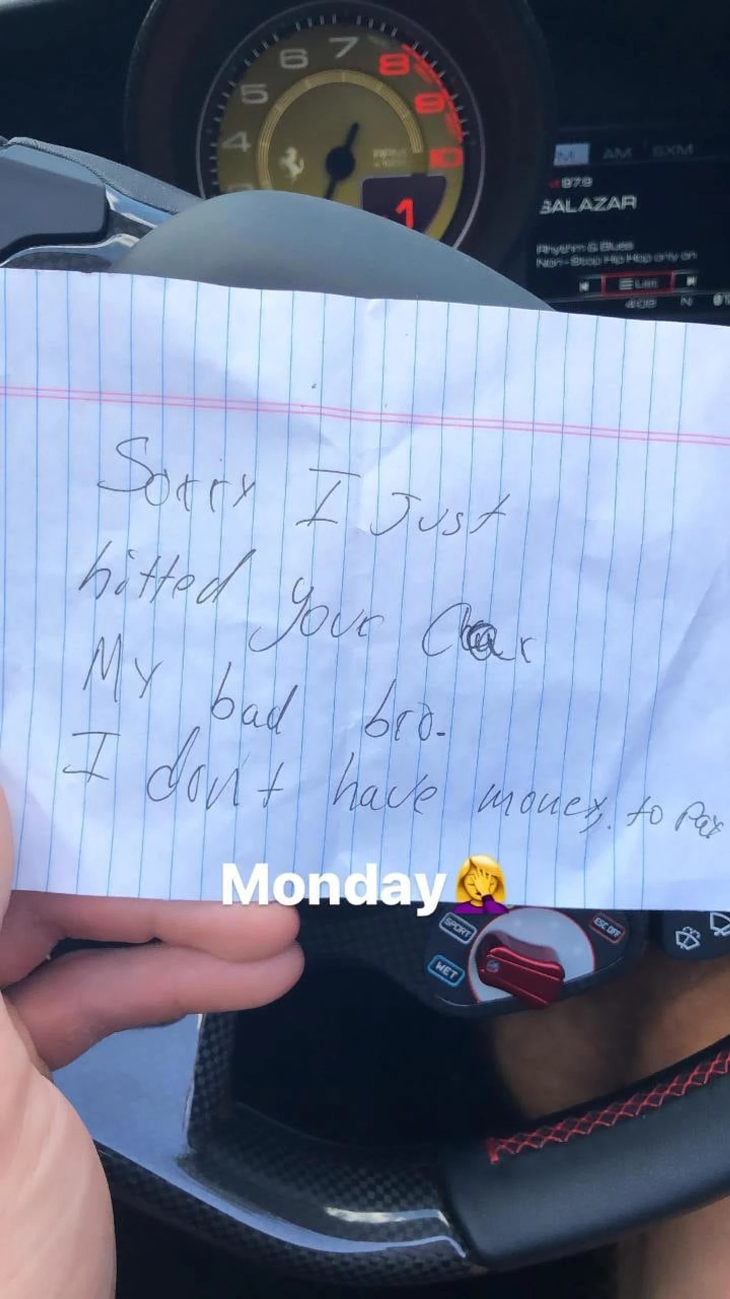 Сидя за рулем, игрок сфотографировал записку, найденную у своего автомобиля: «Sorry, I just hitted your car. My Bad bro, I don’t have money to pay» («Извини, я только что задел твою машину. Моя вина, братан, но у меня нет денег, чтобы заплатить»).