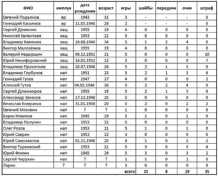 Статистика игроков «Бинокора» на турнире на Приз газеты «Советский спорт» в Минске (сентябрь 1974 года)