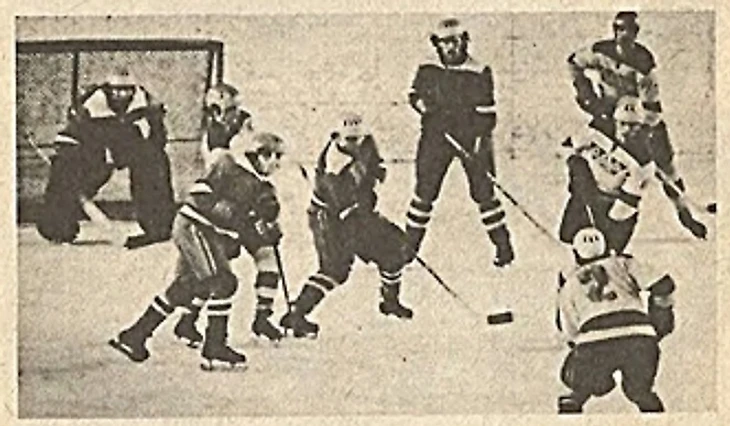 Барнаульский «Мотора» атакует ворота «Высокогорца» из Нижнего Тагила (фото из книги В. Лямкина «Синий лед», Барнаул, 1993)