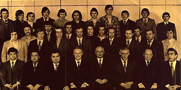 Нижний ряд: В.Г. Ломоносов (четвертый слева), Ш.Р. Рашидов (пятый слева), старший тренер В.И. Столяров (третий справа)