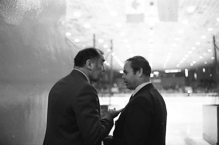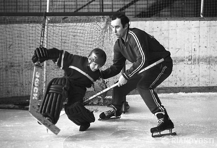 Март 1976 года. Москва. Тренер хоккейной школы «Динамо» Валентин Григорьев с учеником (Дмитрий Донской / Библиотека изображений «РИА Новости»)