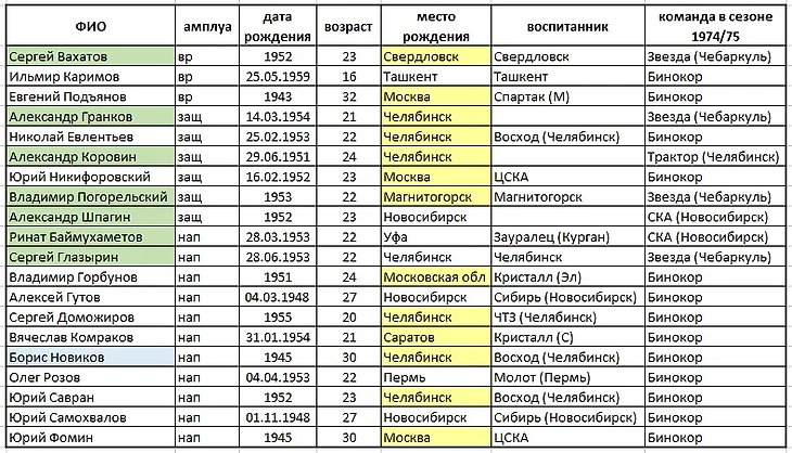 Нападающий Сергей Глазырин. До «Бинокора» выступал за челябинский «Трактор» (1970/71 - 1 игра), челябинский «Сельхозвузовец» (1971/72), запорожскую «Днепроспецсталь» (1972/73), чебаркульскую «Звезду» (1974/75)
