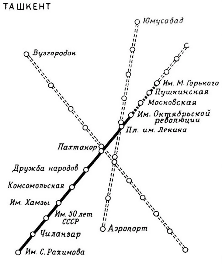 Первый метрополитен в Средней Азии (в СССР раньше только в Москве, Ленинграде, Киеве, Тбилиси, Баку и Харькове). Строительство началось в 1968 году. Первая линия с девятью станциями (длина 12,2 км) была запущена 6 ноября 1977 года.