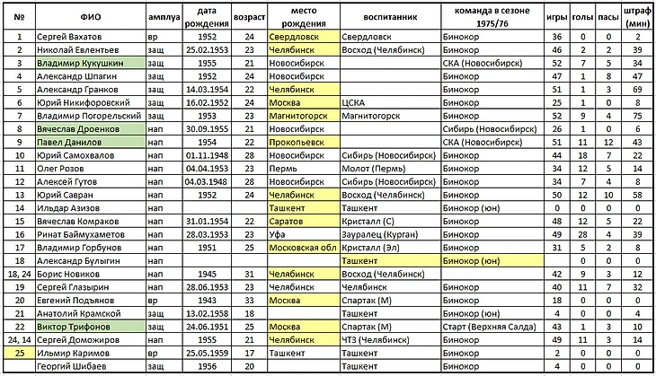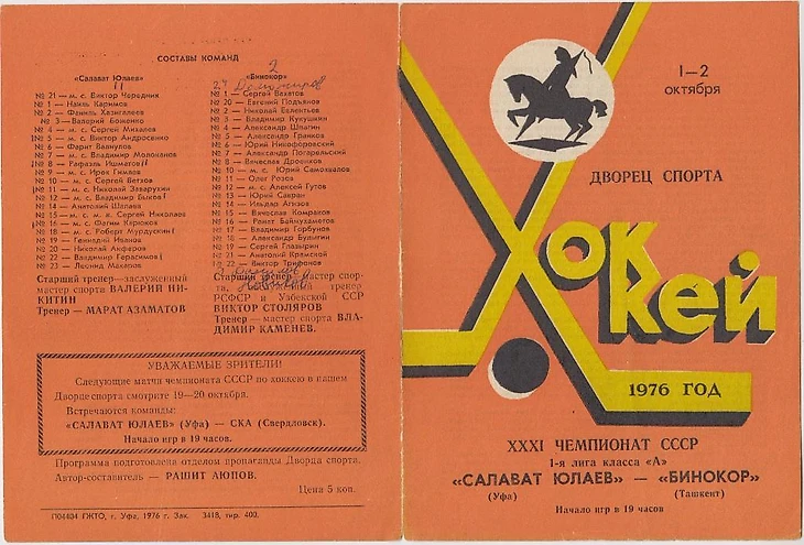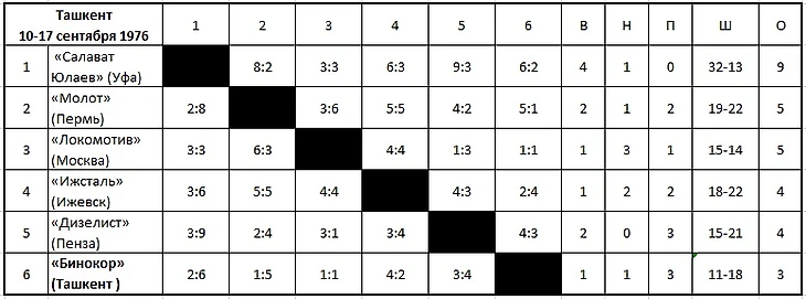 10.09.1976. «Салават Юлаев» (Уфа) - «Бинокор» (Ташкент) - 6:2 (4:0,...).