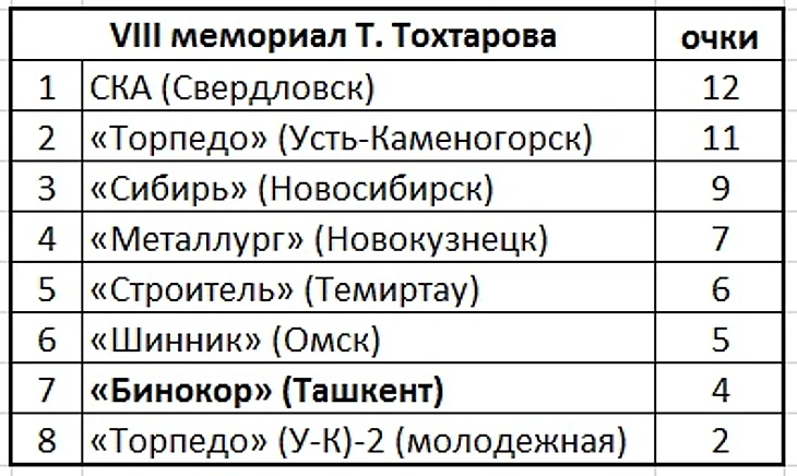 Ташкентцы набрали всего 4 очка (разница шайб 24-28) и заняли предпоследнее седьмое место проиграв пять матчей. Четыре в упорной борьбе: «Шиннику» (2:3), «Строителю» (3:4), главной команде хозяев (4:6) и свердловскому СКА (2:3), а «Сибирью» были разгромлены - 2:9. Выиграли лишь у «Металлурга» (3:2) и молодежного состава «Торпедо» (Усть-Каменогорск) - 8:1.