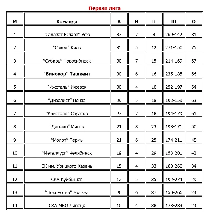 - Интересно, что одним из соперников в 1978 году за выход в Высшую лигу была команда «Бинокор» из экзотического для хоккея Ташкента. Узбекская команда заняла четвёртое место, отстав от «Сокола» на 9 очков.