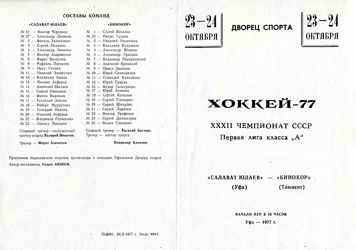 07.09.1977. «Бинокор» (Ташкент) - «Салават Юлаев» (Уфа) - 2:6 (1:2, 1:2, 0:2).