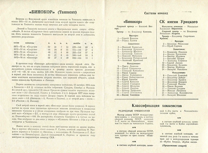 «Свой второй сезон в первой лиге начал более уверенно чем первый. В первых матчах на своем поле ташкентцы принимали минских динамовцев и хоккеистов киевского «Сокола» и у обоих соперников отобрали по три очка. Проиграв первый матч «Сибири» - 2:7, в повторной игре «Бинокор» просто разгромил гостей из Новосибирска – 6:0. Не растерялись хоккеисты из Ташкента и в матчах на выезде. Они отобрали по два очка у лидеров – «Салавата Юлаева» в Уфе и «Металлурга» в Челябинске.» (из казанской программки, ноябрь 1977 года).