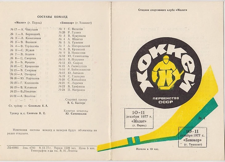 Программка пермского стадиона СК «Молот» к матчам между хозяевами и «Бинокором» в декабре 1977 года