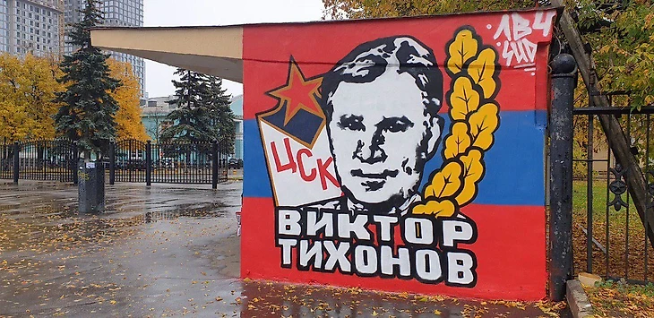 На Ленинградском проспекте, на зданиях кассах ЦСКА, снова появился граффити-портрет Виктора Тихонова – его восстановили болельщики. Изначальную работу закрасили коммунальные службы Москвы закрасили на основании постановления правительства города в августе 2019-го.