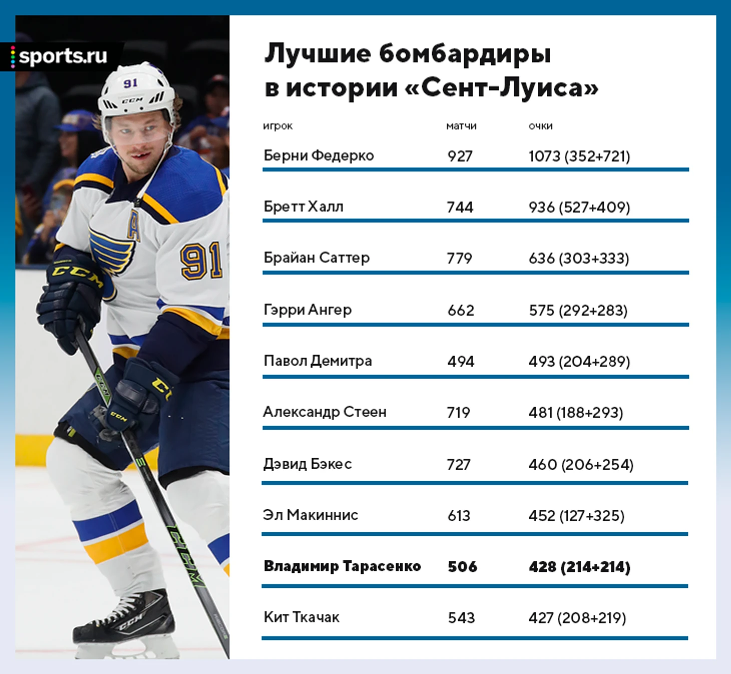 После этого матча на счете Тарасенко 428 очков за карьеру – это 9-й результат среди бомбардиров «Блюз» за всю историю. Позади остался Кит Ткачак (427), впереди – Эл Макиннис с 452 очками.