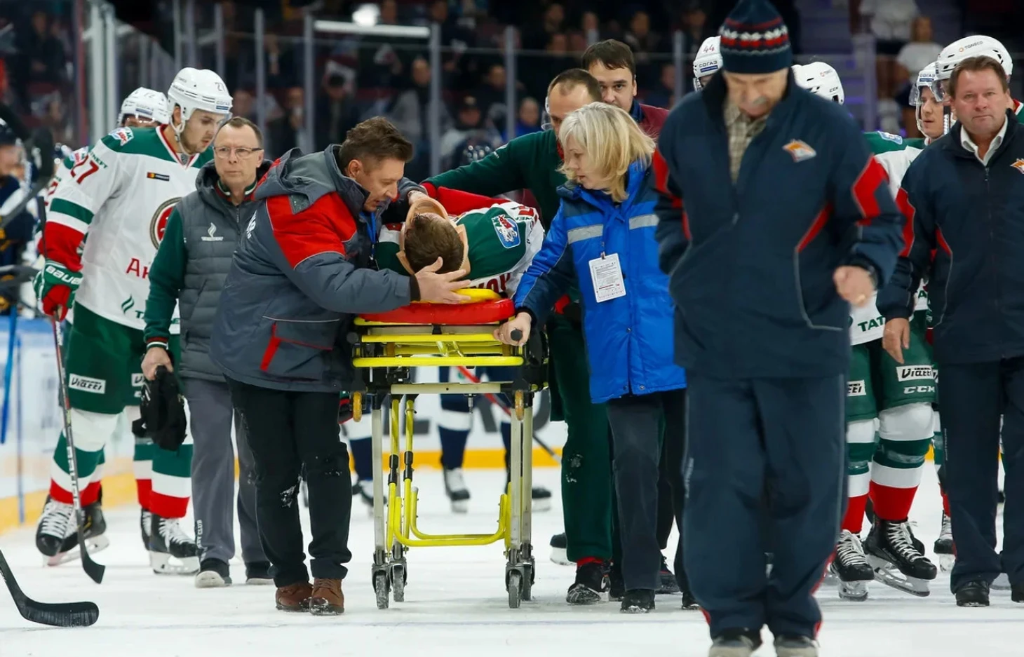 Нарушения не было – чистый силовой, но Ткачев так и не смог самостоятельно подняться со льда. Врачи пару минут оказывали ему помощь, а потом увезли на носилках.