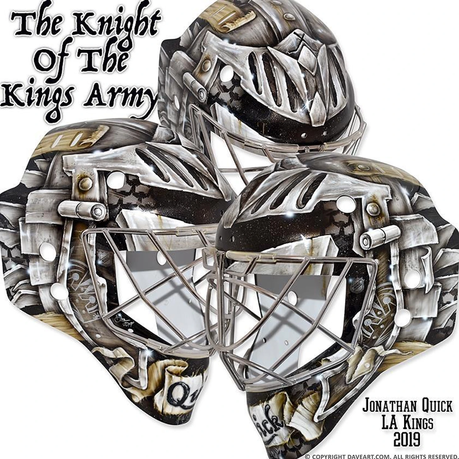 Немного не добрался до тройки, на наш взгляд, Джонатан Куик из «Лос-Анджелеса». Его маска стилизована под настоящий рыцарский шлем с забралом – выглядит очень стильно. На подбороднике же, как на свитке, разместилась фамилия вратаря. Шлем под названием «Рыцарь королевской армии» сделал знакомый нам Дэвид Гуннарссон.