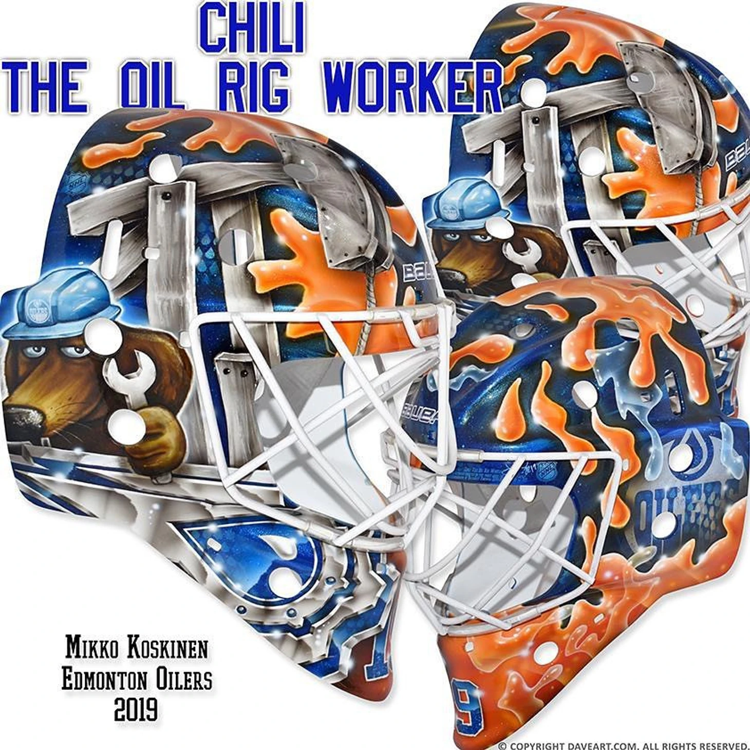 Серебро уходит Микко Коскинену и его яркой нефтяной маске. Голкипер «Эдмонтона» разместил на шлеме буровую вышку и разливающуюся нефть, как главный символ города. Сочетание синего и оранжевого цветов сделали маску очень гармоничной, но главная её фишка в собаке Коскинена Чили, которая изображена в роли рабочего. Своего пса Микко помещал на маски и раньше, а весь шлем сделал Дэвид Гуннарссон.