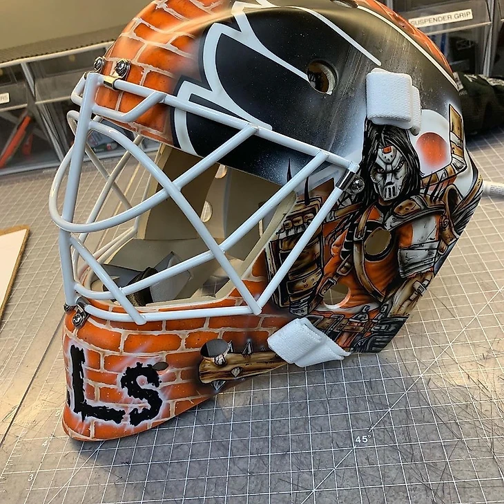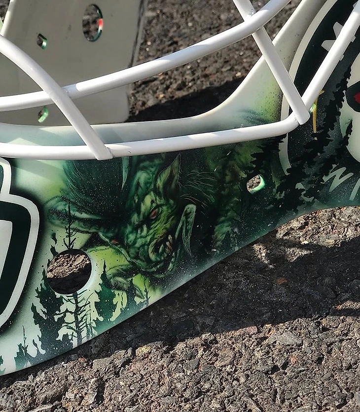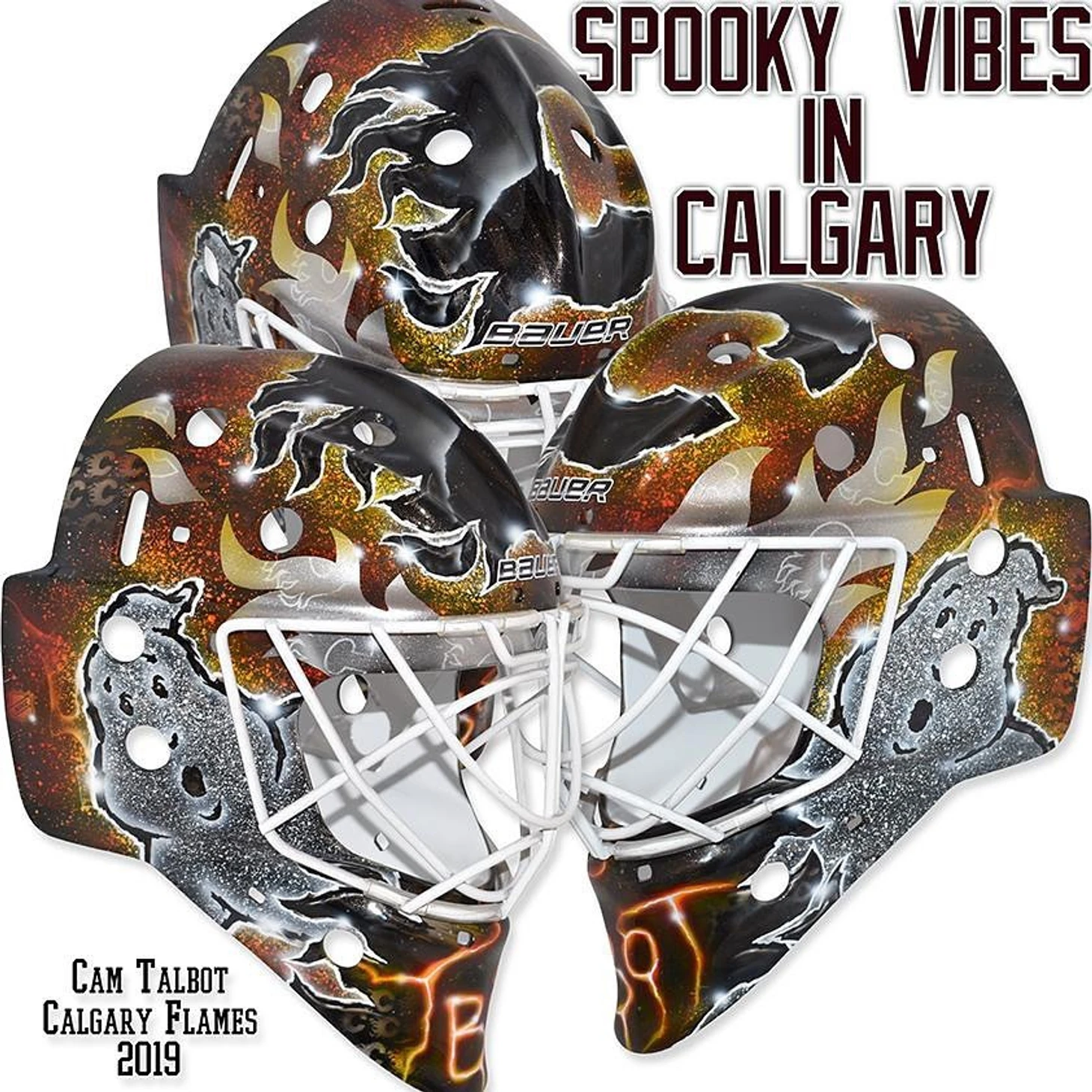 Начнём с любителя охотников за привидениями Кэма Тэлбот. Страж ворот «Калгари» нанёс на маску двух призраков по бокам и огромный логотип клуба сверху, дополненный языками пламени и как будто покрытый золотой пылью. Дизайнером маски выступил Дэвид Гуннарссон, известный под псевдонимом DaveArt. Вполне креативно Кэм, но только 10 место.