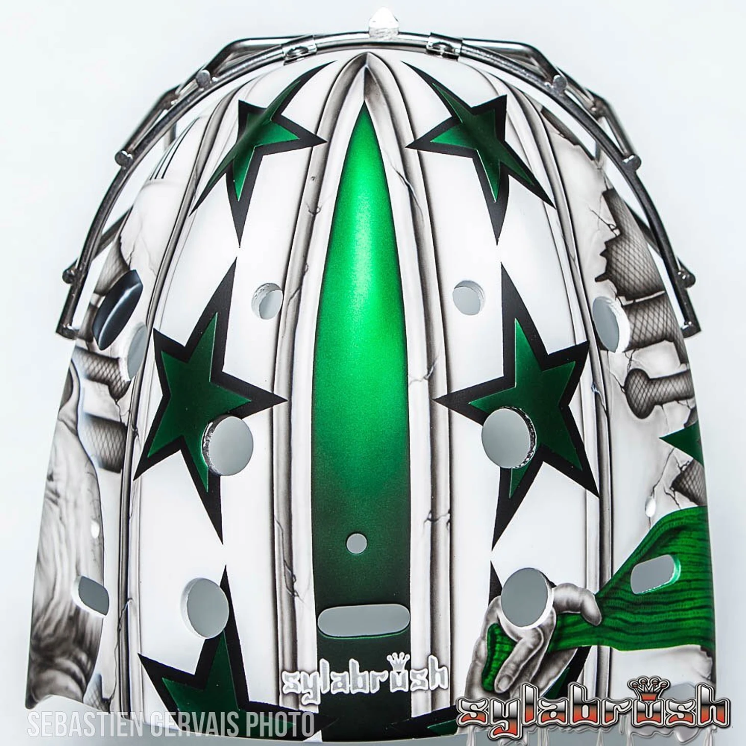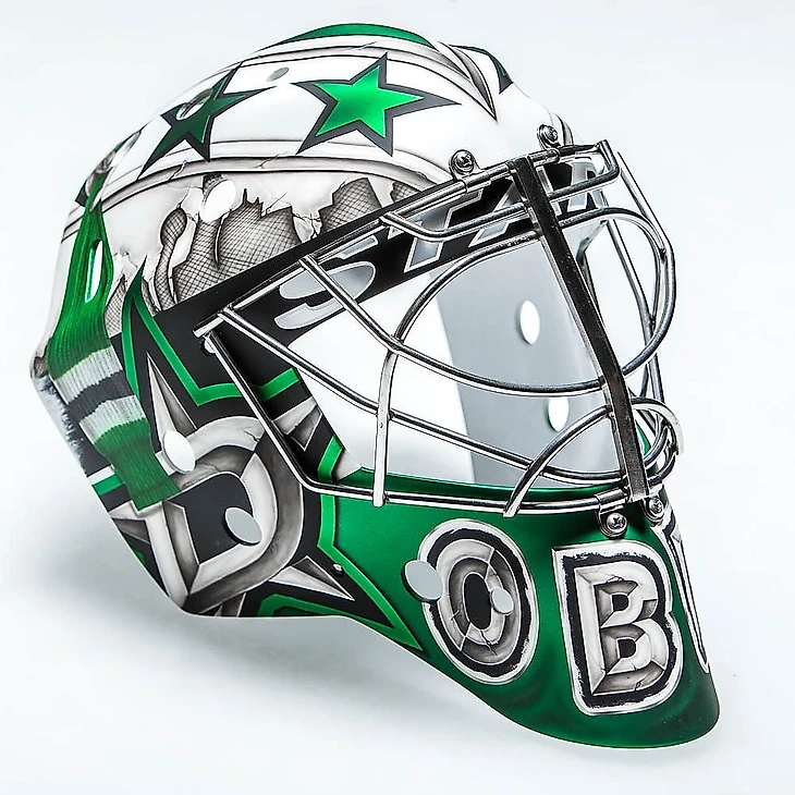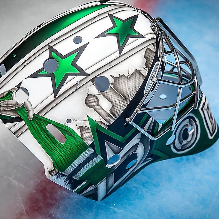 И лучшая, по нашему мнению, маска нового сезона НХЛ – Антон Худобин, «Даллас Старс». Думать над тематикой шлема Антону не приходится, уже несколько лет подряд он обыгрывает одного и того же персонажа. Но в этот раз дизайнер Sylabrush постаралась на славу. Цвета клуба со звёздами, очертания небоскрёбов Далласа, прозвище «Добби» во весь низ маски и, конечно же, крутейший зеленоглазый эльф на одной стороне и дырявый носок на другой. Классная отсылка и классное исполнение. Так держать, Антон.