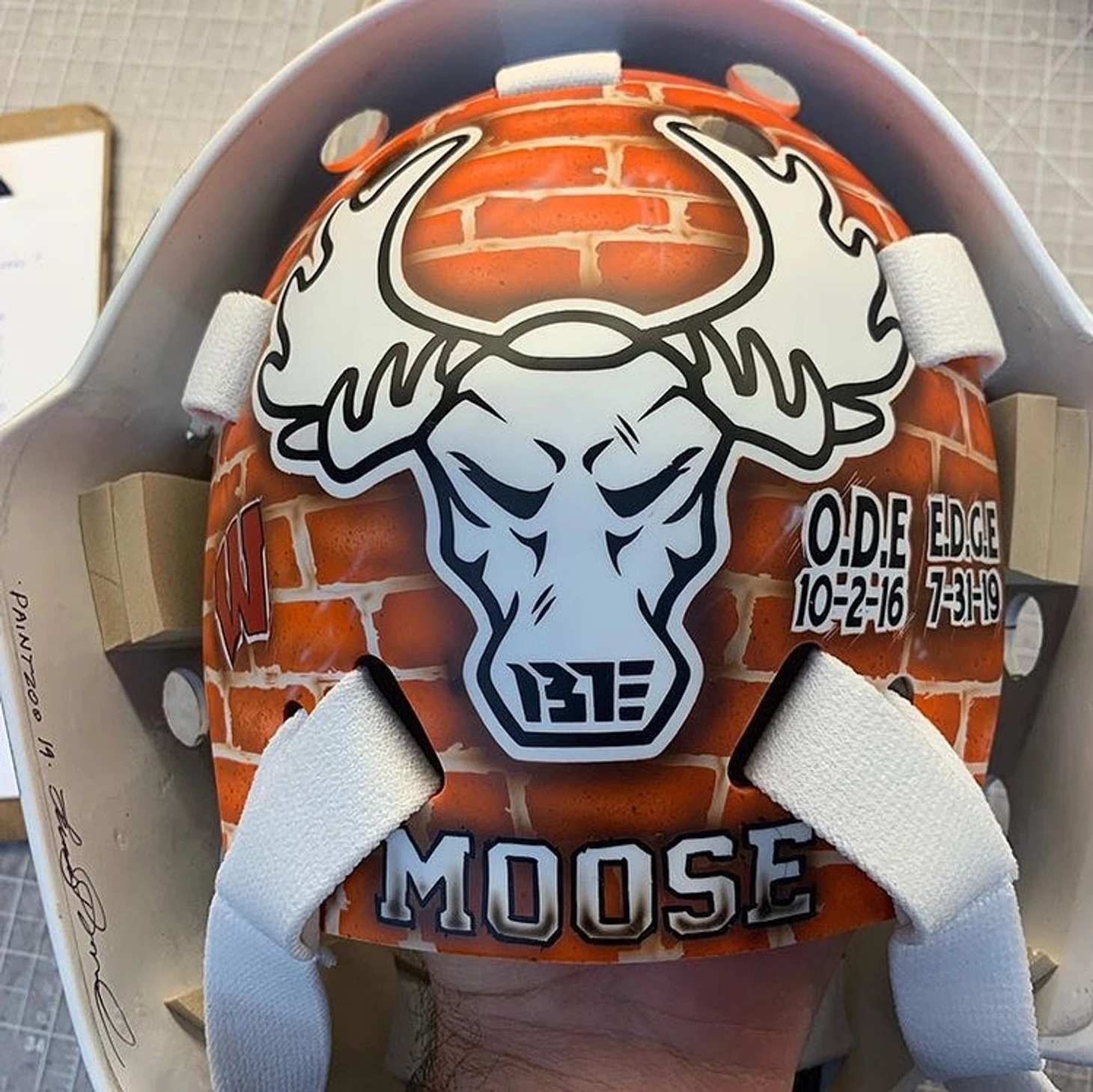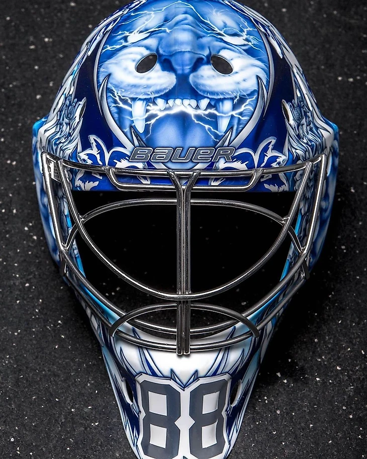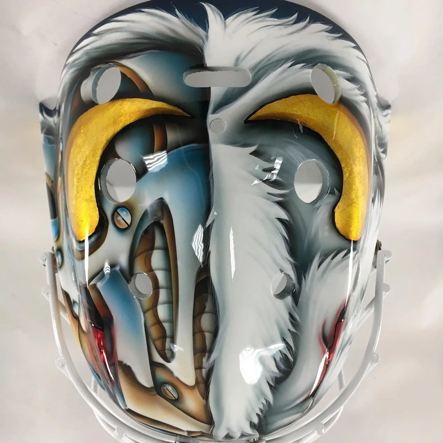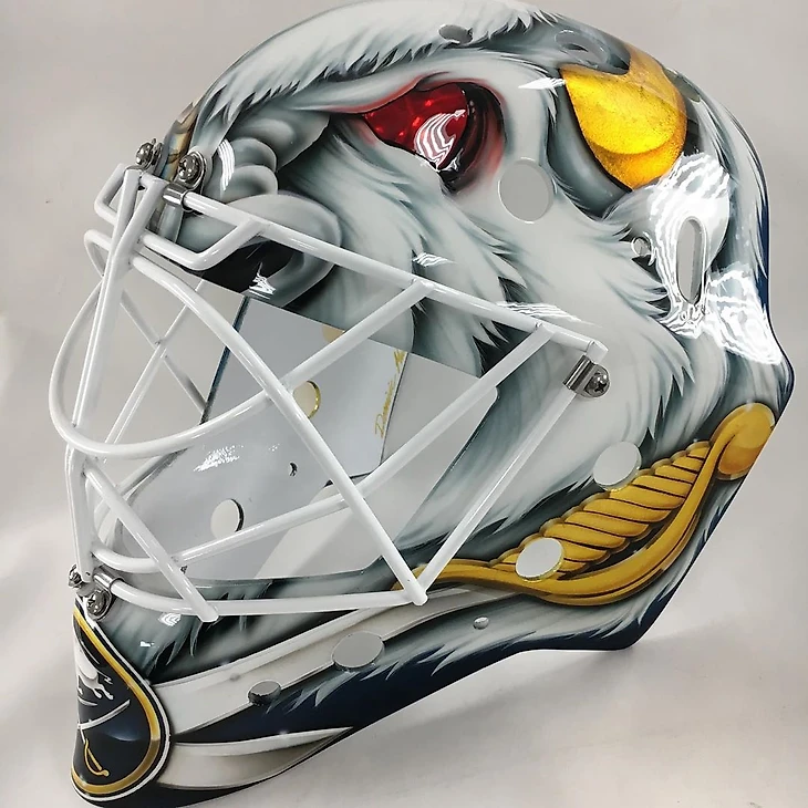 Следом крутая, но слегка запутанная маска вратаря «Баффало» Картера Хаттона. Логотип клуба и две сабли по бокам смотрятся логично, а вот к разделению верхушки шлема стоит присмотреться. Хаттон разграничил дикого буйвола на 2 части: более дикую и более благородную. Смотрится круто, но не совсем понятно. Сделал маску Jesse’s Custom Design.