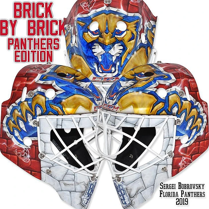 Далее маска нового голкипера «Флориды» Сергея Бобровского. Стилизованный под кирпичную стену шлем дополнен огромной рисованной пантерой, которая занимает добрую половину маски. Не обошлось и без клубных цветов и подбородника с номером. Просто, но ярко и стильно. Задизайнил маску всё тот же DaveArt.