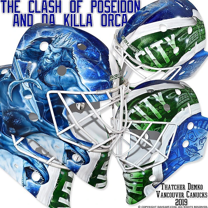 На шестой позиции бэкап «Ванкувера» Тэтчер Демко и его мифологическая маска. Такие отсылки на шлемах встретишь не часто, но Дэмко разместил на маске огромного Посейдона с трезубцем и сразу несколько логотипов клуба – косаток. Сине-зеленые цвета шлема круто сочетаются, а дизайнером маски выступил DaveArt.
